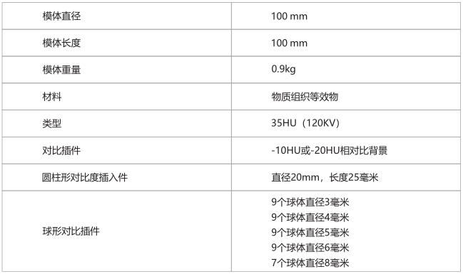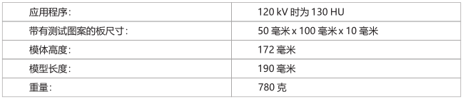 该模体设计用于评估3D X射线成像模式在xy平面和轴向平面上的成像能力。CT扫描仪的低对比度分辨率能力可以通过使用轴向图像和冠状面重建的单个螺旋扫描获得。该模体显示了所有扫描、图像重建和显示参数的影响。