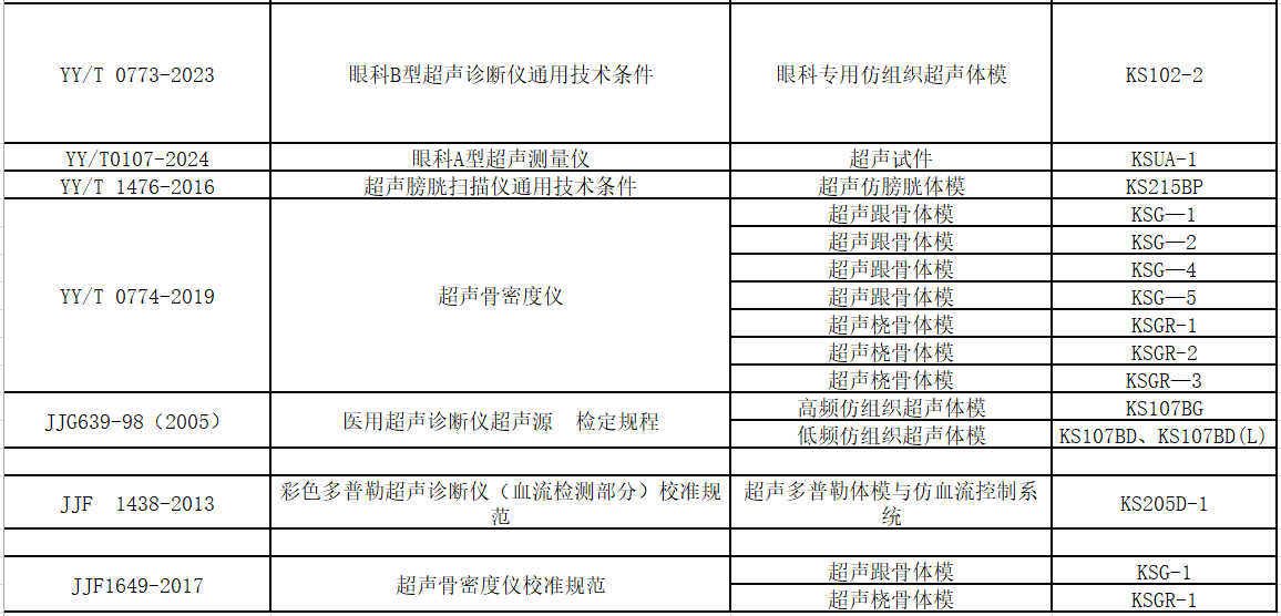一般会涉及: 常规检测超声影像 KS107BD(L)(低频适用)、KS107BG(高频适用);切片厚度检测 KS107BQ , 三维成像检测 KS107-3D ,多普勒血流检测 KS205D-1 。考虑探头温升测试,还要考虑 测温体模 KS205TW-1和 KS205TW-2