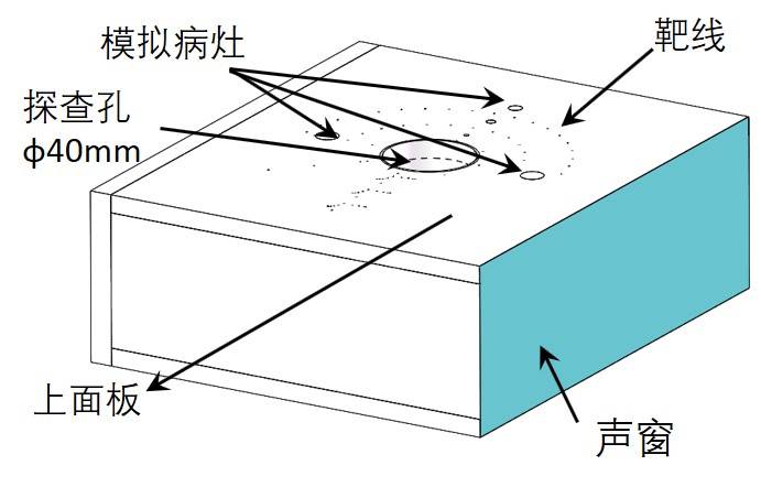 盲区靶群。靶线中心至声窗垂直距离分别为8,7,6,5,4,3,2mm。声窗相邻靶线中心横向间距为10mm和15mm。