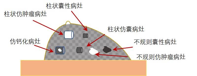 体模外形呈乳腺形状,其外尺寸为170mm(长)×130mm(宽)×70mm(高),体模底板尺寸为210mm(长)×170mm(宽),重量为1.05kg。其上部由塑料薄膜声窗包裹背景仿组织材料构成,背景仿组织材料内部包含有bing灶,病灶有仿囊性bing灶、仿肿瘤病灶(对比度bing灶)、仿钙化bing灶,bing灶为柱状外形或不规则外形。仿钙化bing灶由囊性外包裹高阻抗核心构成。柱状病灶尺寸为6mm、10mm不等。体模内材料均由符合国家标准要求的TM材料作为标准传声媒质。仿组织材料外部包围着一层软质塑料薄膜,作为仿真乳腺体模的声窗,该声窗是由与水及仿组织材料匹配较好的材料制成。体模底板上留有一大小约为50mm的保养孔,作为日常对体模进行抽气与注射保养液的通道,保养孔上粘贴有厚度为2mm的真空橡皮进行密封。体模外观及内部靶标设置示意图如图1所示。仿真乳腺体模照片如图2所示。